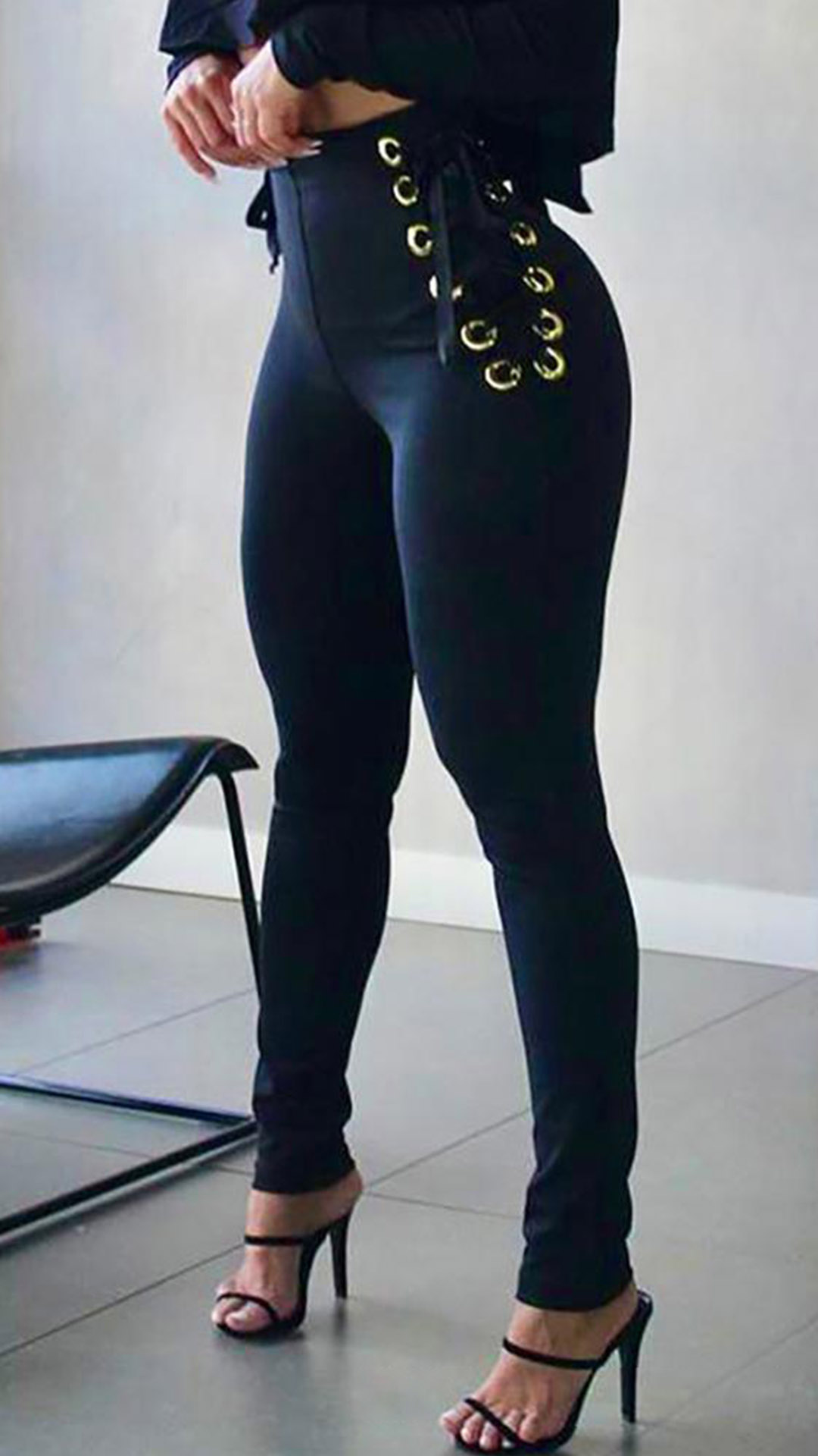 Fashion Keyhole Lace-up High Waist Solid Color Tight Pants