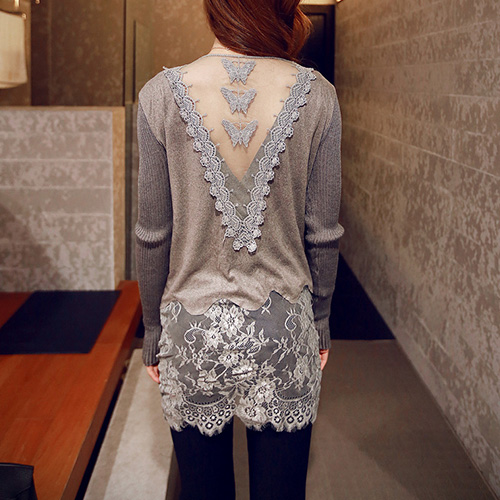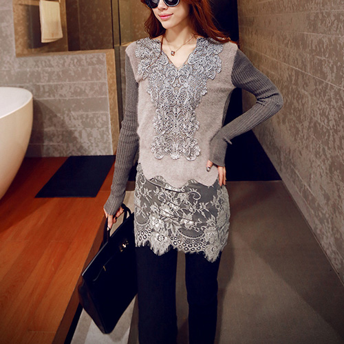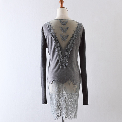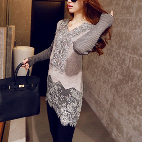 Fashion Knitted Long Sleeve Spliced Lace Crochet Dress