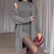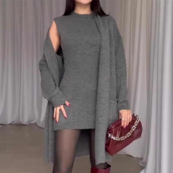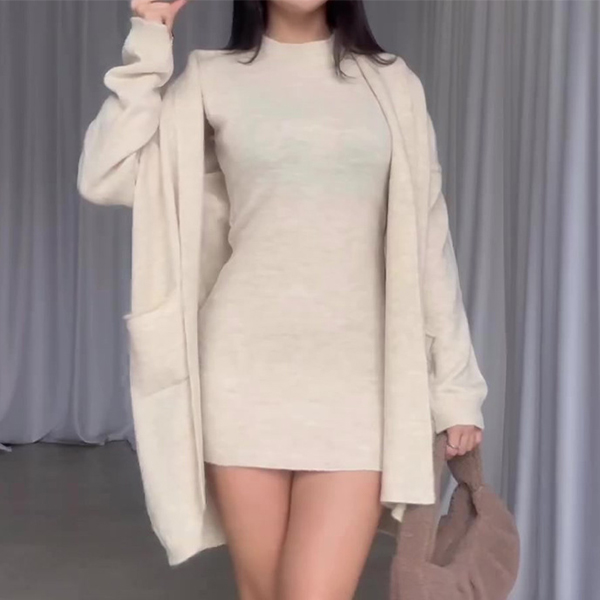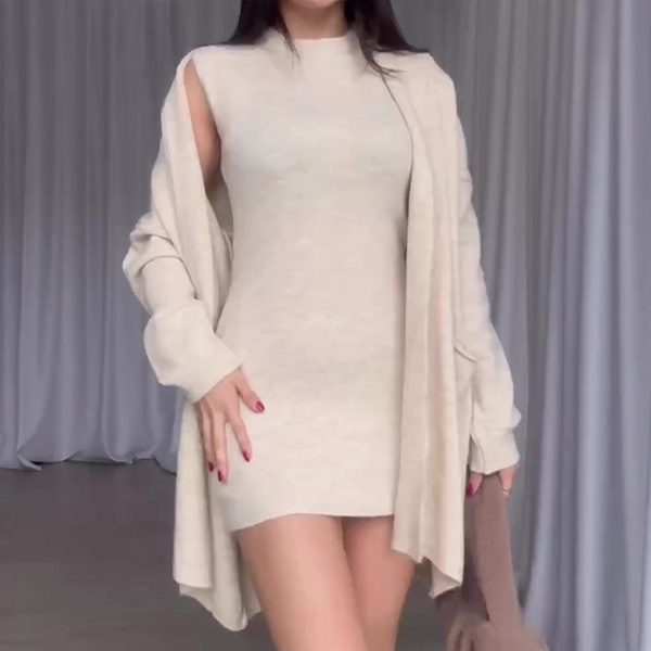 Step out in style with this fashionable knitted two-piece set consisting of a longline cardigan and sleeveless dress. The longline cardigan adds a cozy and chic layer to your outfit, perfect for cooler weather. The sleeveless dress can be worn on its own or layered under the cardigan for a versatile look. The knitted fabric offers warmth and comfort, while the two-piece set allows for easy styling and coordination. Hope you like it.