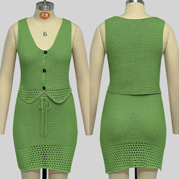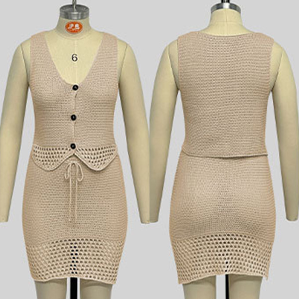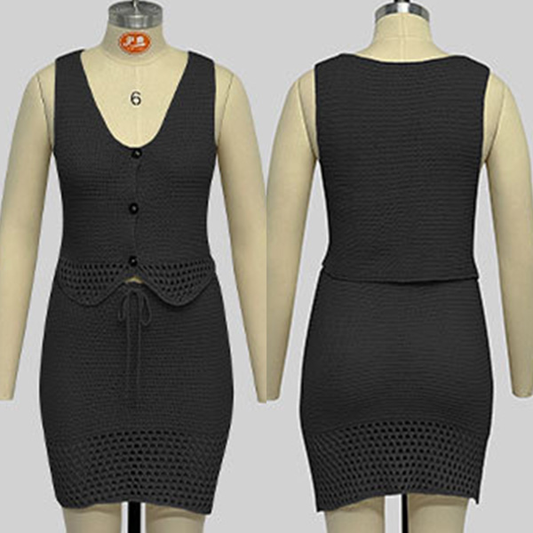 This knitted Two-piece Set consists of a sleeveless vest and a matching skirt. The fabric is soft and cozy, making it perfect for both casual and dressier occasions.