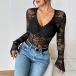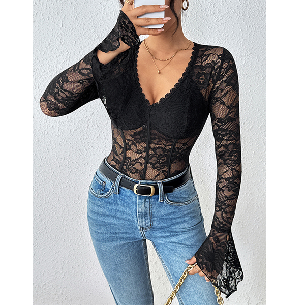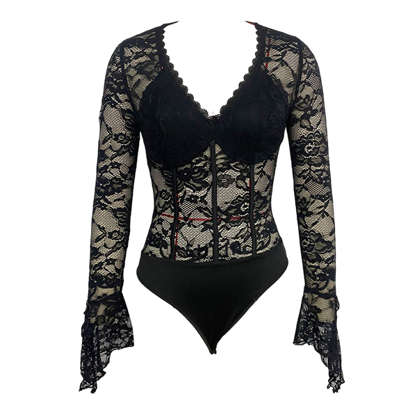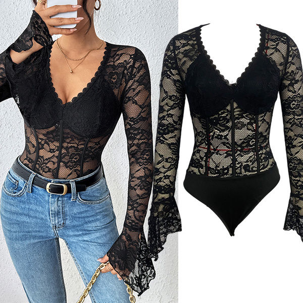 Fashion Lace Corset Bodysuit - Scalloped V-Neck & Flare Sleeves