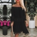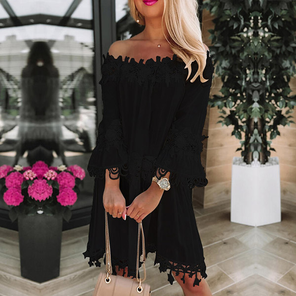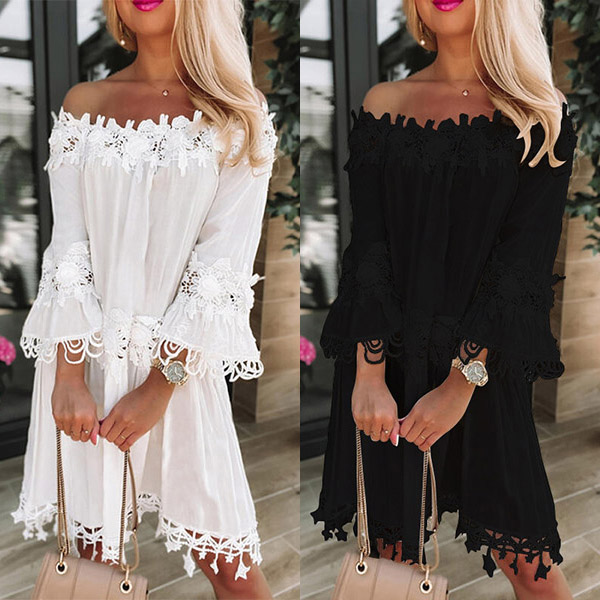 This mini dress features a beautiful lace-spliced design that adds a touch of elegance and femininity to the dress. The off-the-shoulder design is trendy and stylish, while the trumpet sleeves add a touch of drama and flair. White and black, which one do you like?