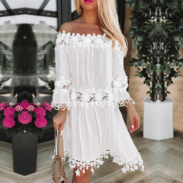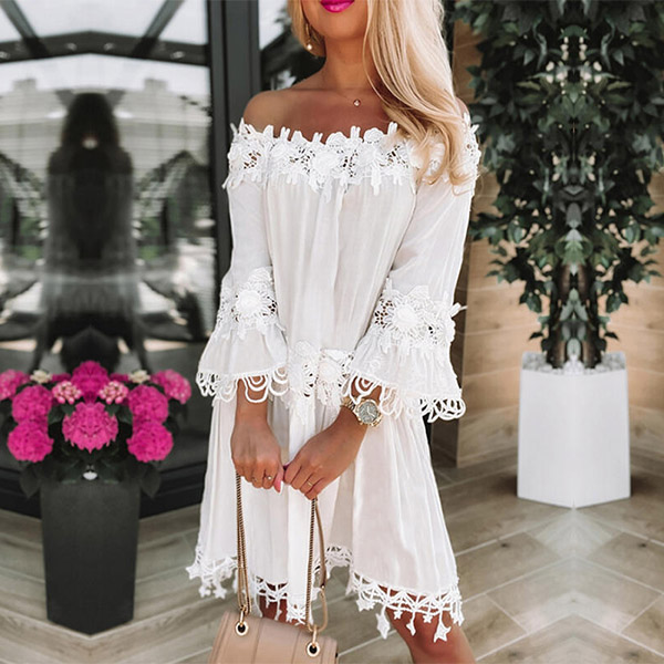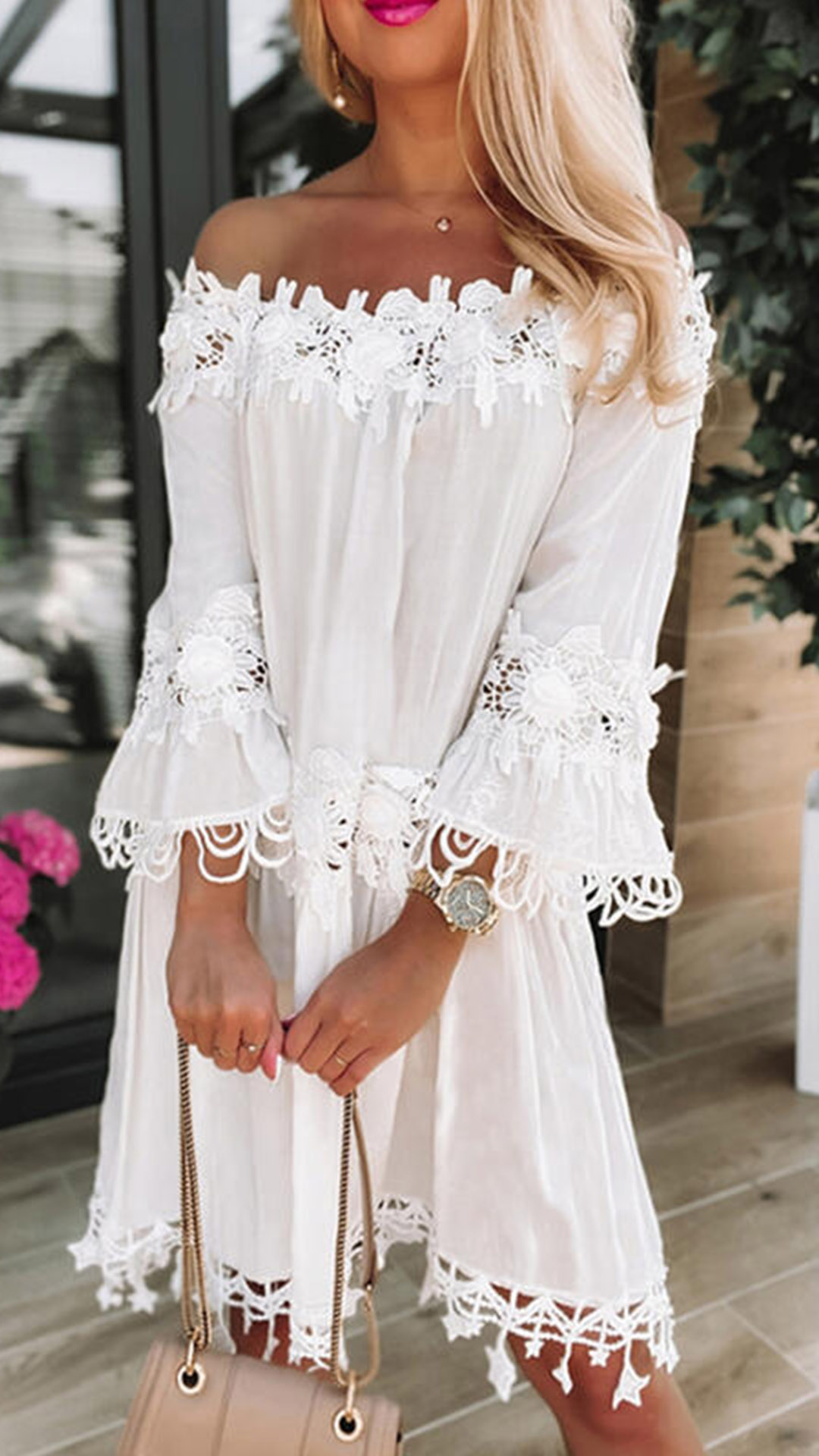 Fashion Lace Splcied Off-the-shoulder Trumpt Sleeve Mini Dress