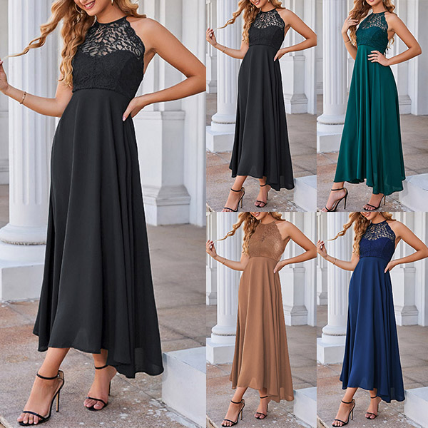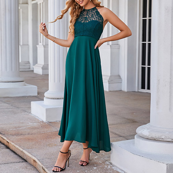 How about this dress? The halter neckline and backless design are both sexy and stylish, while the lace spliced detail adds a touch of elegance. Wanna have a try?