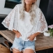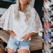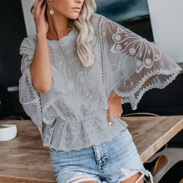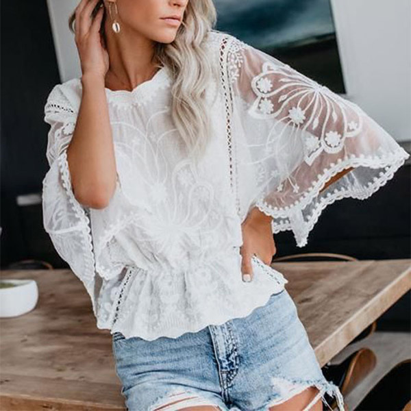 This unique and fashion-forward shirt features a combination of lace and a batwing sleeve design, creating a visually striking and feminine garment. Pair with shorts or jeans for a fashion summer look.