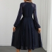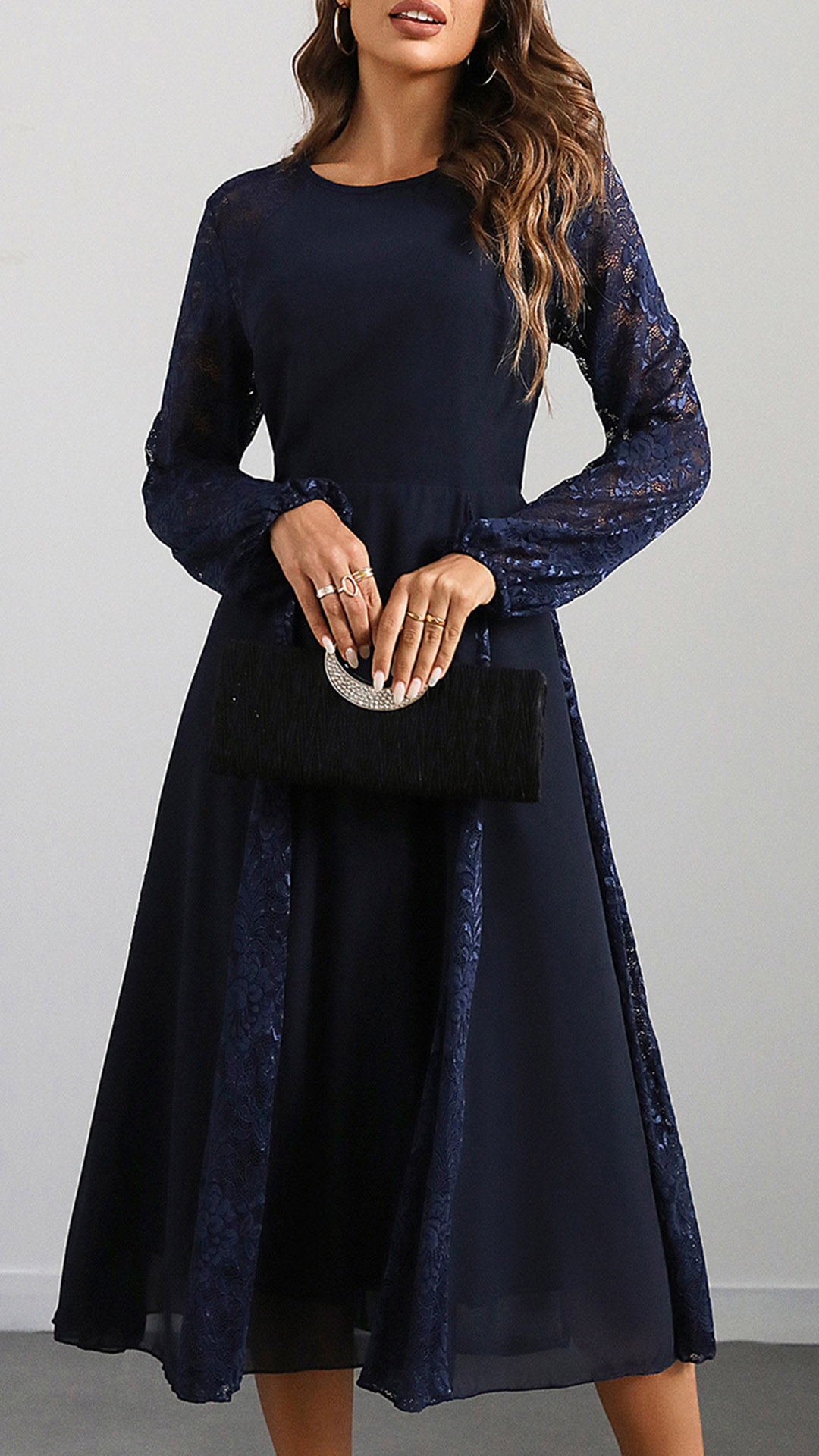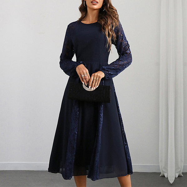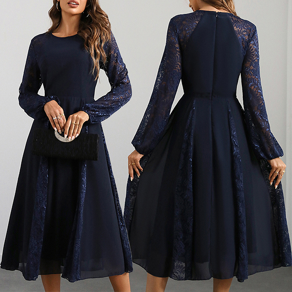 This dress features a crew neck, long sleeves, intricate lace splicing, and a high-rise waist, creating a sophisticated and chic look that is perfect for special occasions and events. Add this stunning and versatile midi dress to your collection for a timeless and elegant option that is perfect for any special occasion.