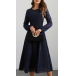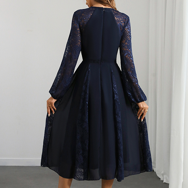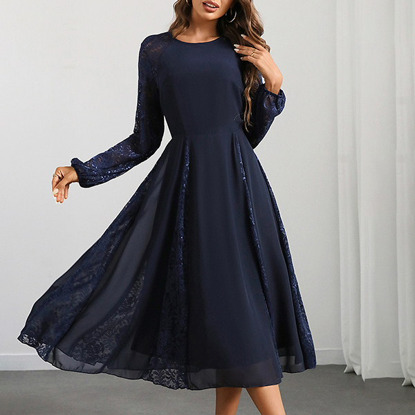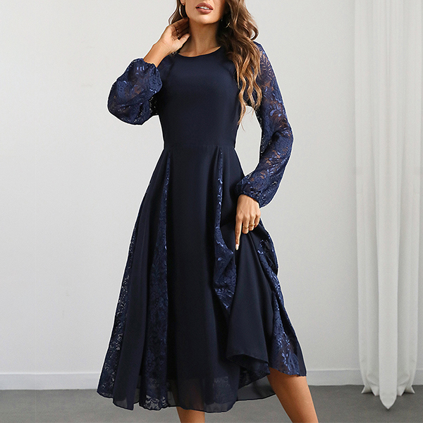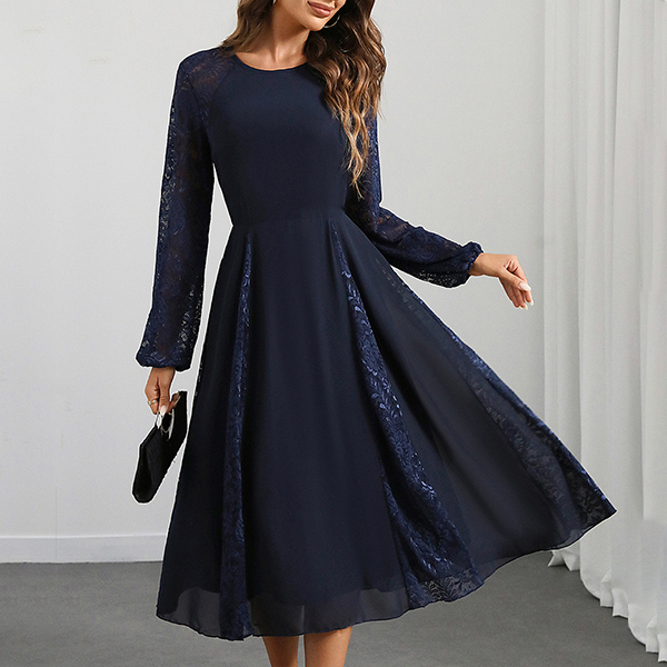Fashion Lace Spliced Crew Neck Long Sleeve High-rise Midi Dress