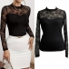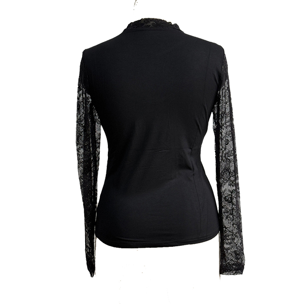 This black shirt features classic crew neck styling with romantic lace spliced detailing and comfortable long sleeves for contemporary feminine elegance. Pair with tailored bottoms and flats for sophisticated casual appeal.