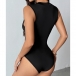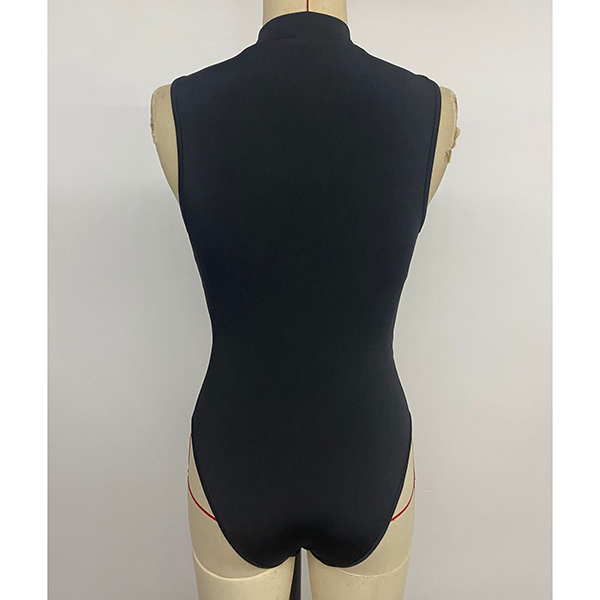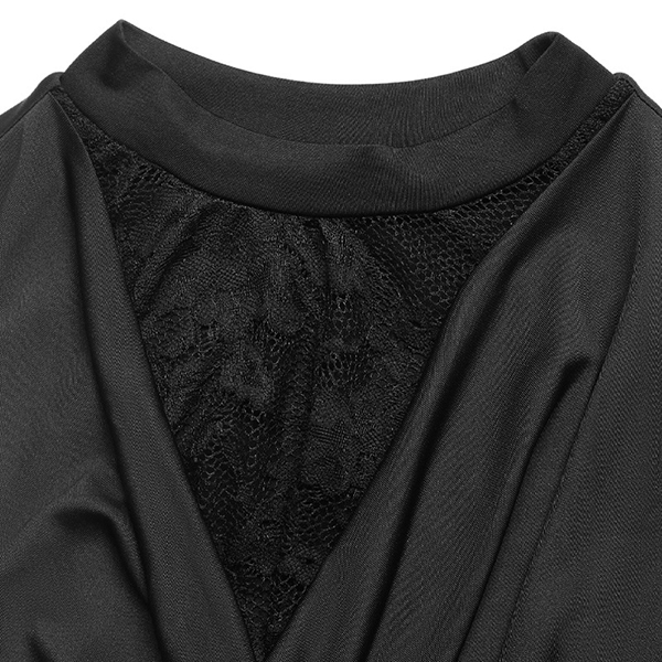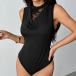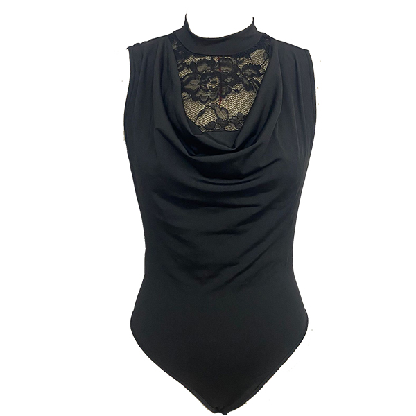 This black bodysuit features contemporary fashion styling with elegant lace spliced construction and graceful draped neck design for refined romantic sophistication. Pair with high-rise bottoms for fashion daily look.