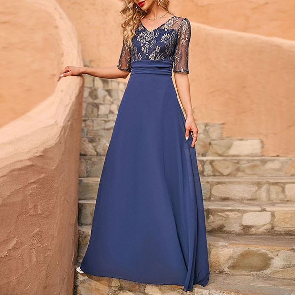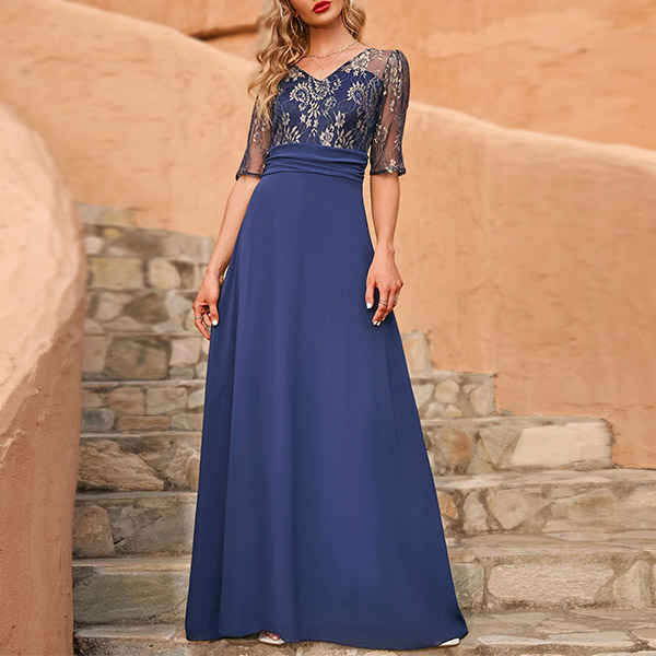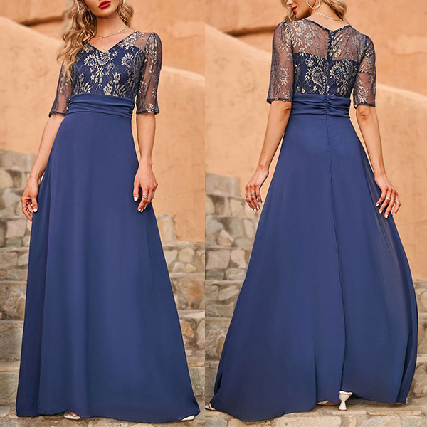 Fashion Lace Spliced Elbow Sleeve Long Party Dress