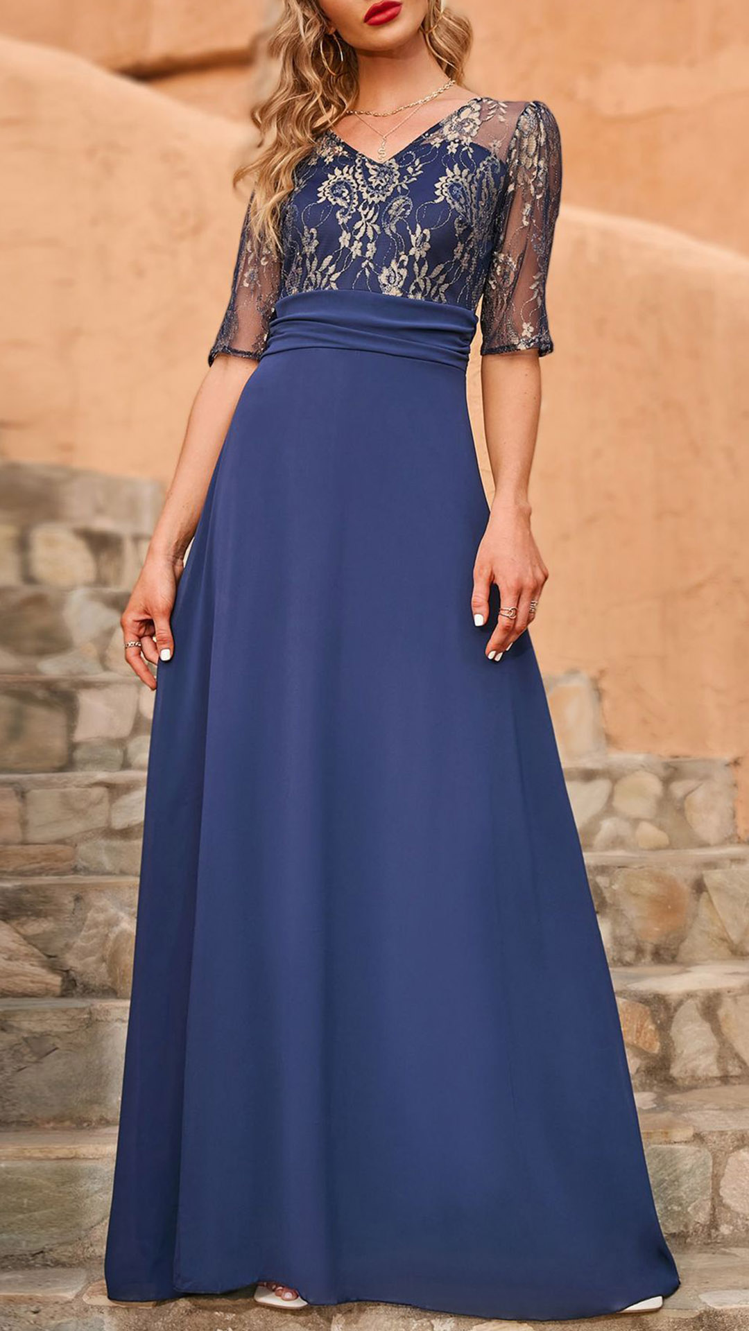 This party dress is perfect for any formal occasion! It features a beautiful lace spliced bodice with elbow sleeve design. The skirt is long and flowy, making it perfect for dancing the night away.