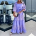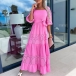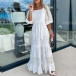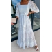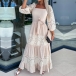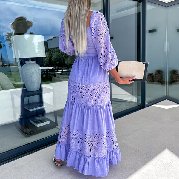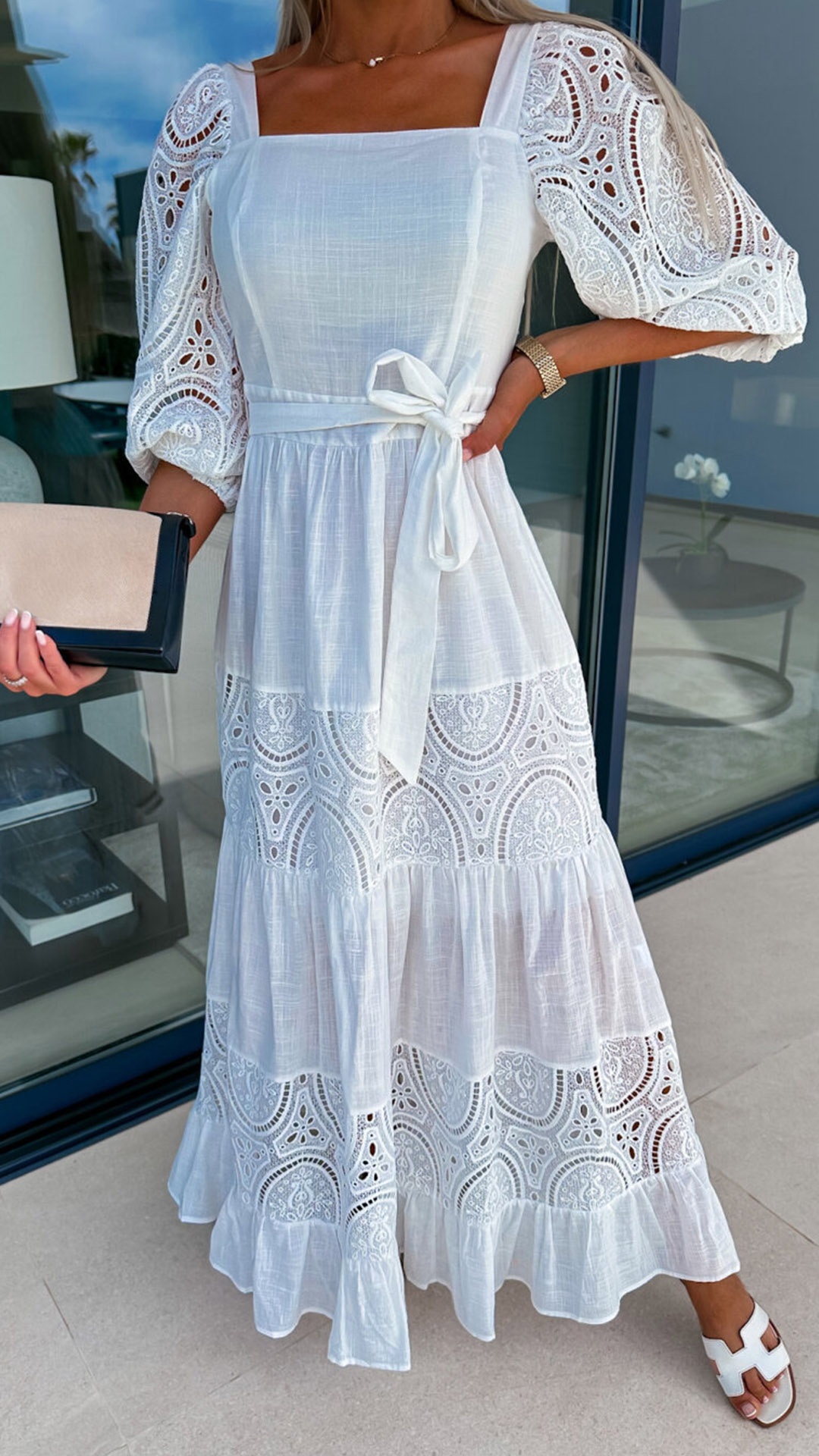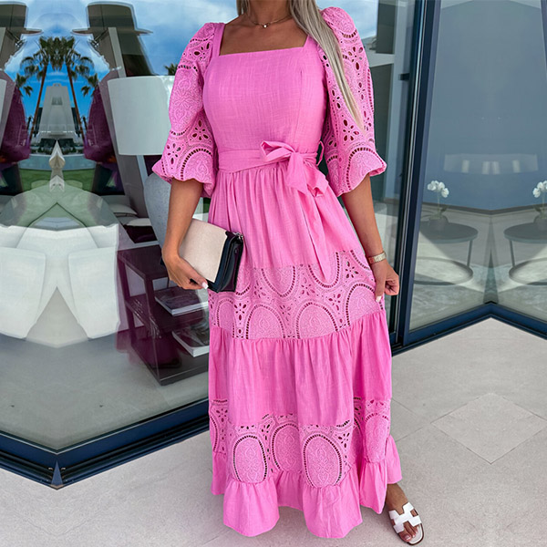 Fashion Lace Spliced Elbow Sleeve Square Neck Self-tie Maxi Dress