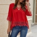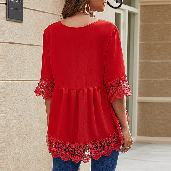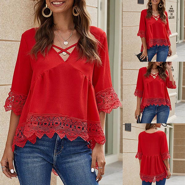 Start your wonderful day from a delightful piece such as this top. It boasts the eye-catching red tone,finished with half sleeve,v-neck,a high-low hem and lace spliced details,this wonderful piece can showcase your style and charm. You can just invite this piece to your wardrobe to enrich it.