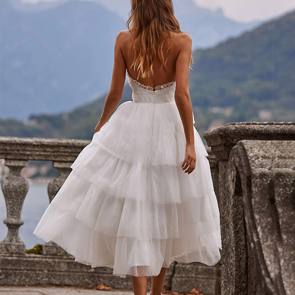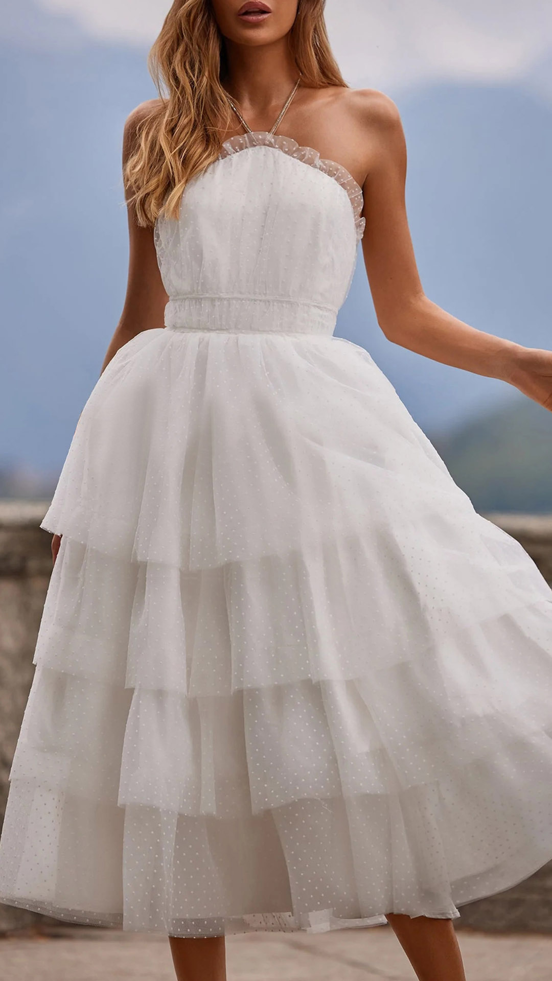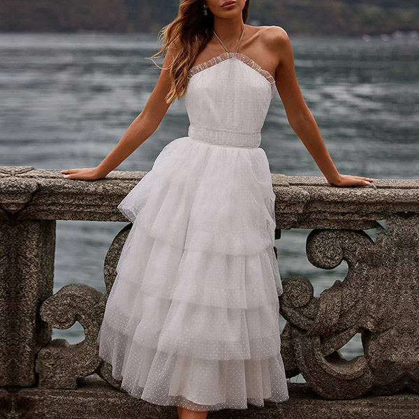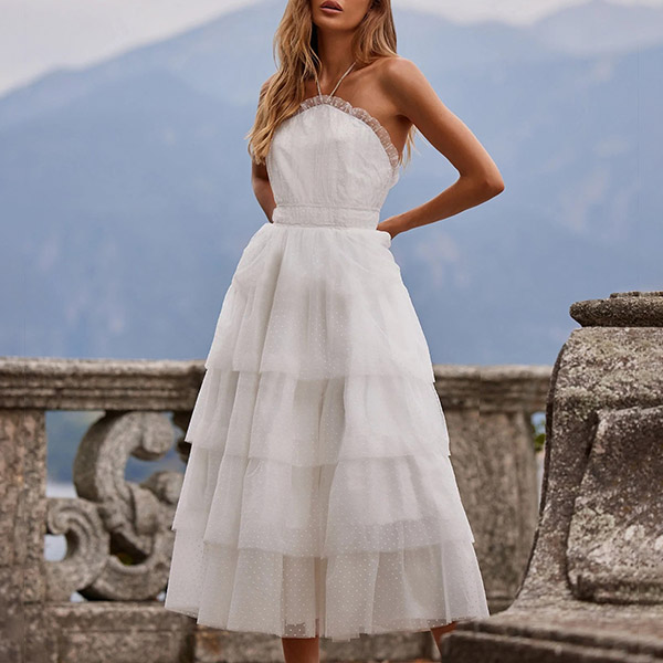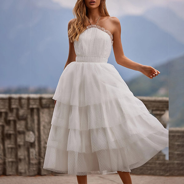 This dress seamlessly combines elegant lace detailing with a flirty and feminine silhouette. The lace spliced design adds a touch of delicacy and allure to the dress, while the halterneck style highlights your shoulders and neckline. The backless feature adds a hint of sensuality and charm, making a statement from every angle. With its tiered construction, it creates a playful and layered look that adds movement and dimension to the dress. This dress is perfect for special occasions and events where you want to exude confidence and grace.