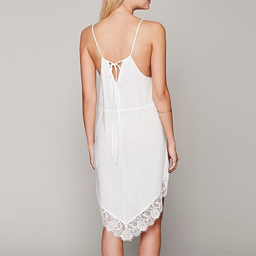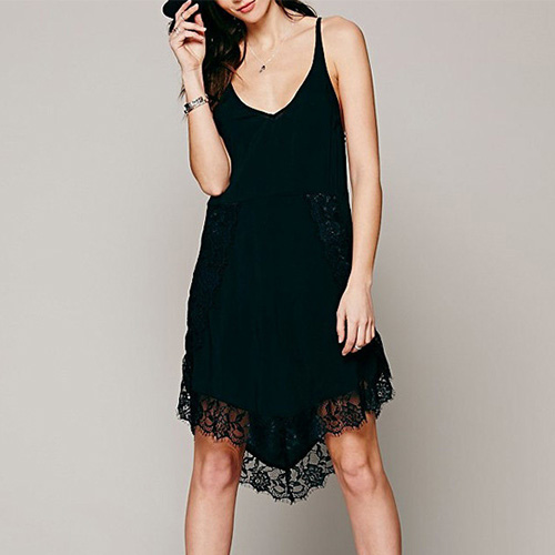 Simple but not simple. This sling dress with v-neck,irregular hemline with lace spliced design,