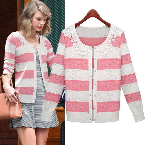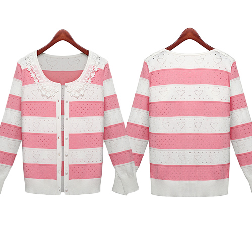Fashion Lace Spliced Long Sleeve Knitted Striped Cardigan