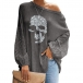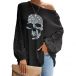 Fashion Lace Spliced Long Sleeve Oblique Shoulder Skull Head Loose T-shirt