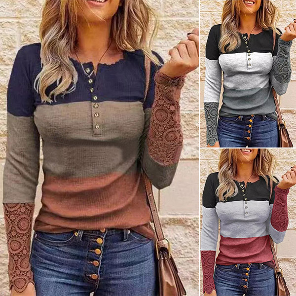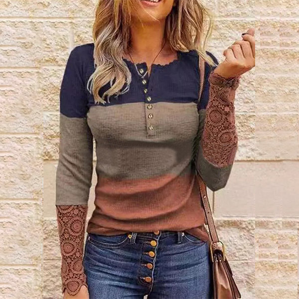 Thanks to the contrast color element and lace spliced details at the sleeve part,this t-shirt can easily enrich the design style. Crafted from soft and breathable fabric,thus piece also can ensure you a comfortable day. And the button details at the neckline part will add some extra charm. All-match design allows to be matched with different style bottoms.