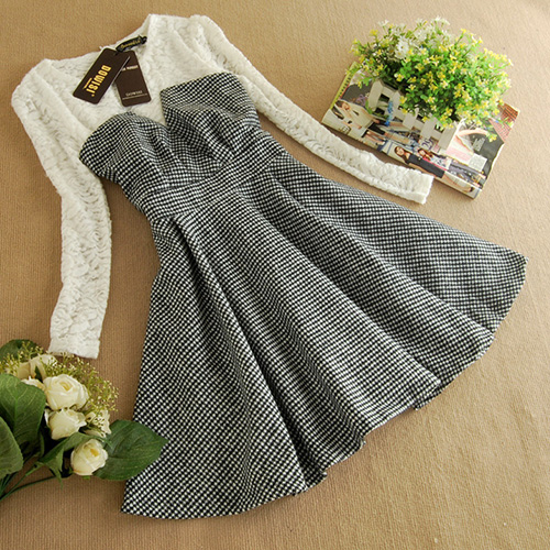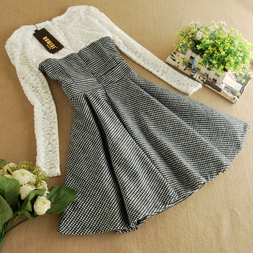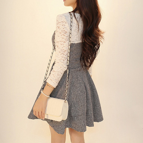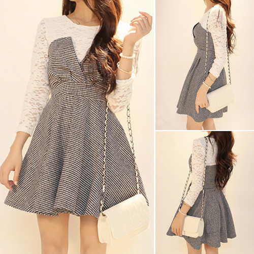 How about this one? It features Houndstooth pattern,with long sleeve,round neck and lace spliced design,simple but not
