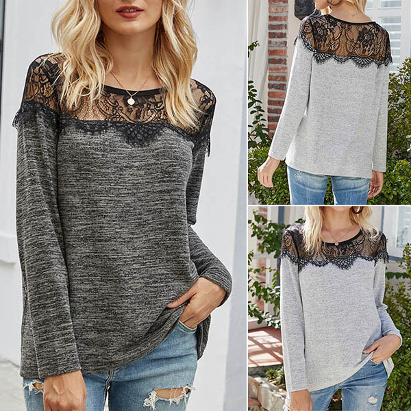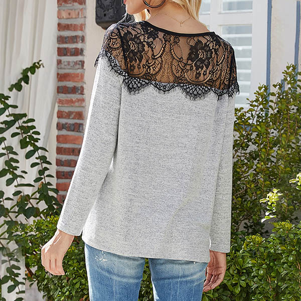 Fashion Lace Spliced Long Sleeve Round Neck Knit Top