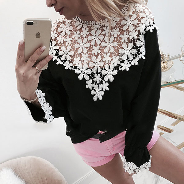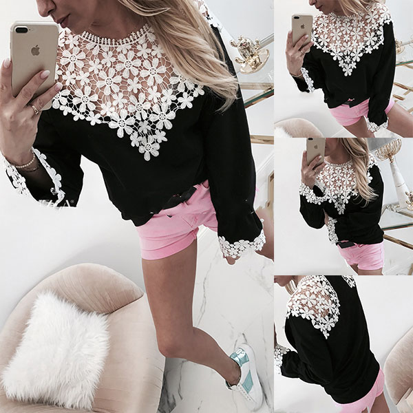 Only need one glance,you would be attracted by this chic and stylish t-shirt. The hollow out lace spliced details are the highlights,which make this piece look so stylish and attractive. Crafted form soft and breathable fabric,with long sleeve and round neck design,this piece can offer you a fashionable daily look by teaming with your jeans.