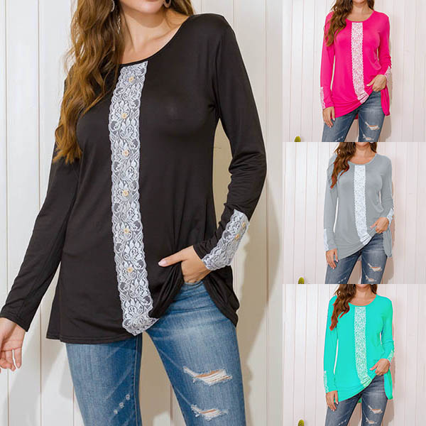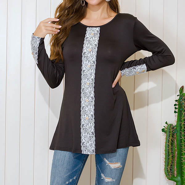 Your lazy days and casual weekend call for such a simple,casual yet stylish t-shirt. Crafted from soft and breathable fabric,with long sleeve and round neck design,this piece can maintain the comfy. Moreover,the lace spliced details will further enhance its charm. Update your casual wardrobe ensemble with this little piece.