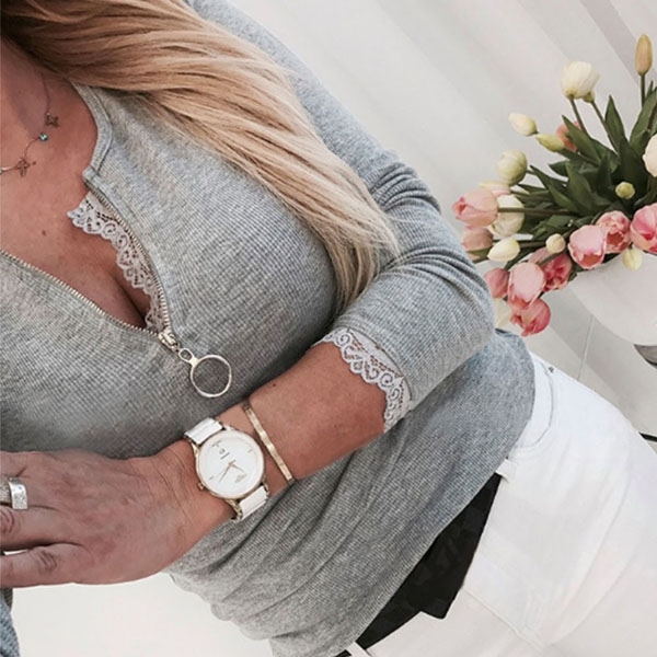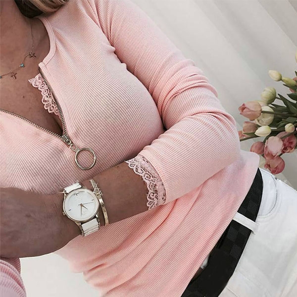 Solid color style,the lace spliced details enrich the design style as well as boost the charm.