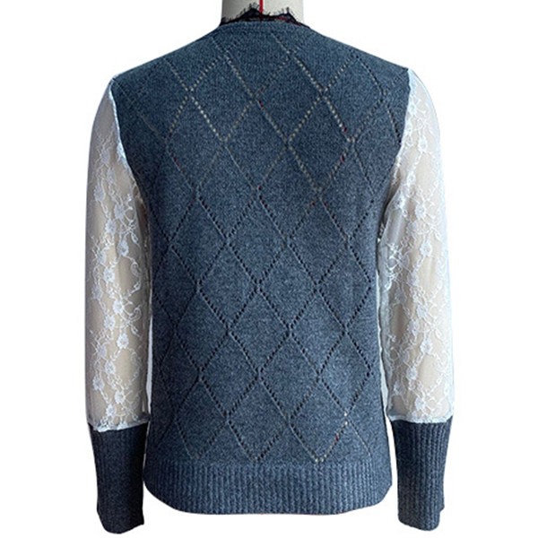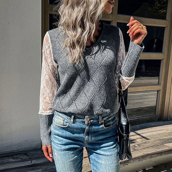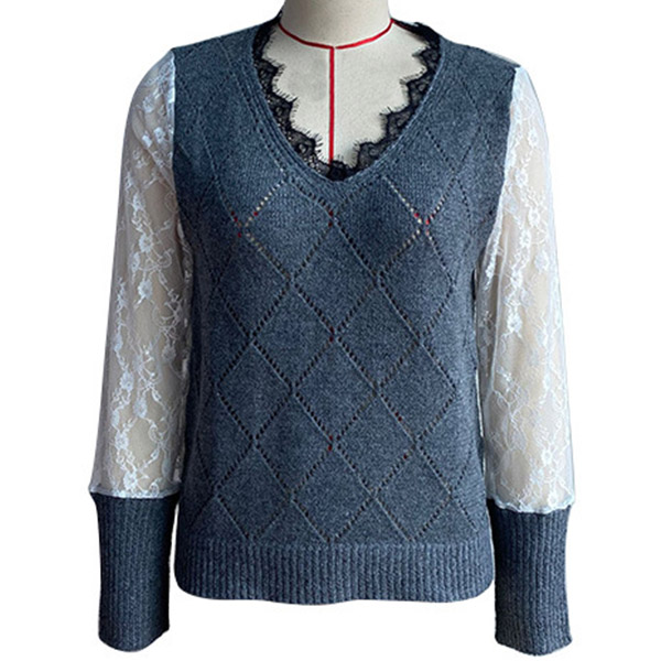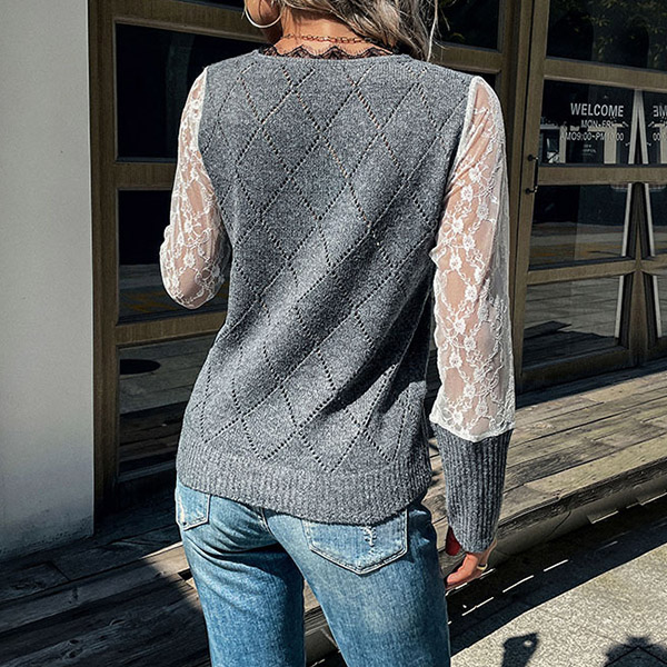 Fashion Lace Spliced Long Sleeve V-neck Sweater