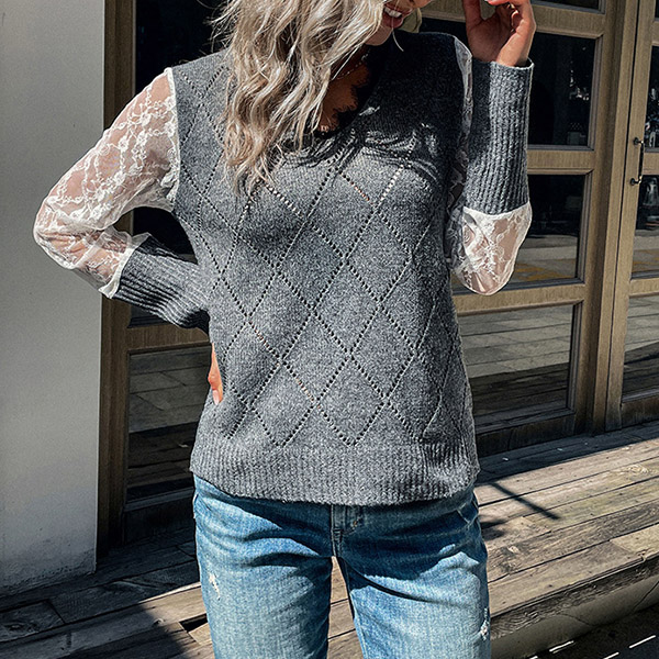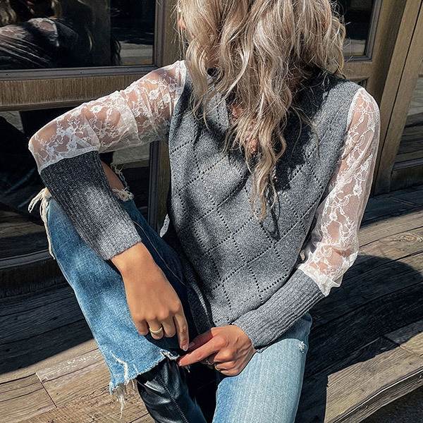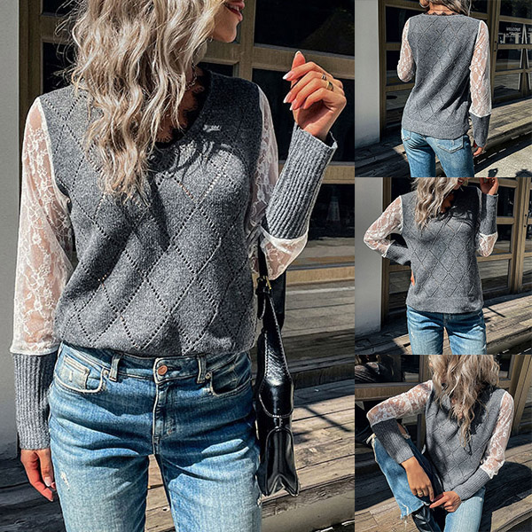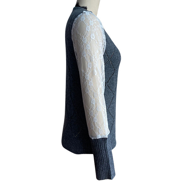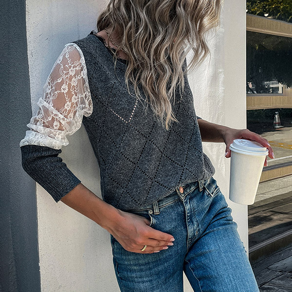 This sweater is designed to bring a touch of elegance and femininity to your wardrobe. The lace spliced detailing along the long sleeve adds a feminine and intricate touch to the sweater. It creates a beautiful contrast and adds a touch of elegance to your look. Hope you like it.