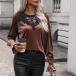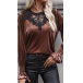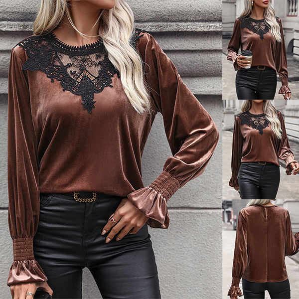 Look at this shirt! The lace spliced detailing along the neckline adds a feminine and delicate touch, creating a stylish and eye-catching look. And the long sleeve with smocked and ruffled cuff exudes a chic and romantic vibe. The velvet fabric adds a touch of glamour and makes it suitable for special occasions or dressier events.