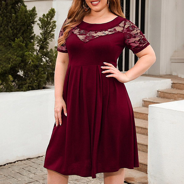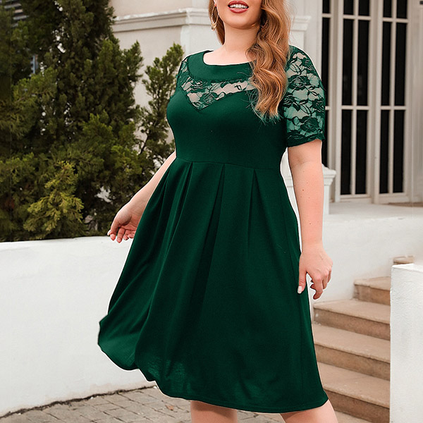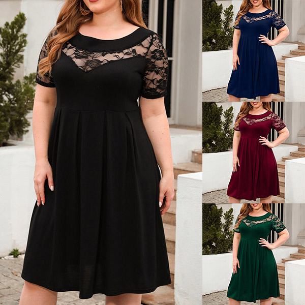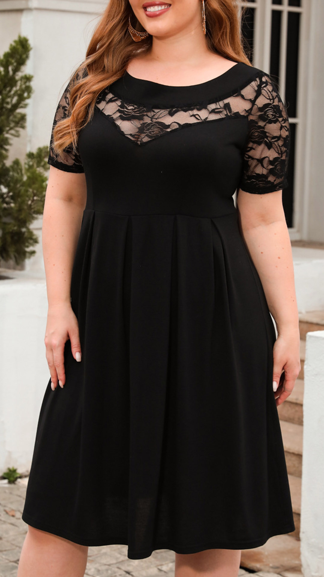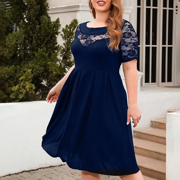 This dress is designed for our beautiful plus-size ladies who want to embrace their curves and feel confident and stylish. The round neckline adds a classic and timeless touch, while the short sleeves provide comfort and ease of movement. The lace spliced detailing on the dress adds a feminine and elegant touch, creating a chic and sophisticated look.