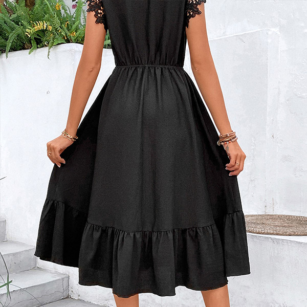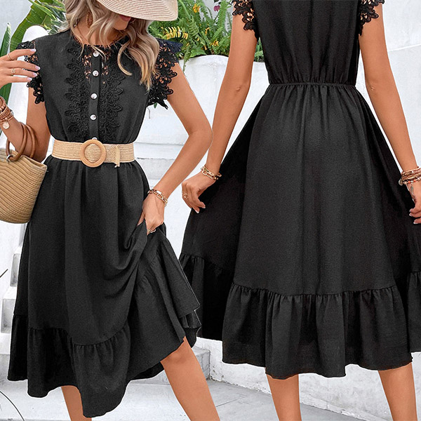 This dress combines feminine charm with modern style, making it a perfect choice for any occasion. The round neck and sleeveless design of this midi dress create a flattering and elegant silhouette. The delicate lace splicing adds a touch of romance and sophistication, making it a standout piece in your collection.