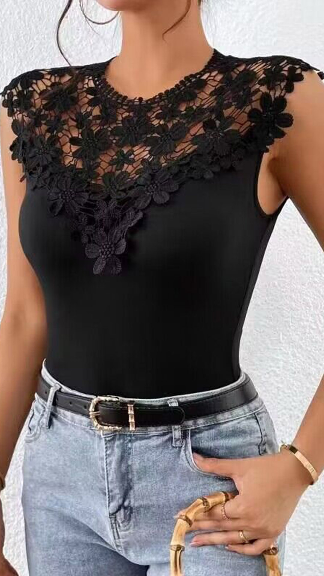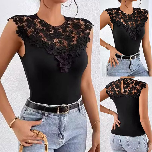 This fashionable top features lace spliced, round neck, sleeveless and slim fit slihoutte, you could pair it with jeans, shorts or any style of bottoms for a fashion look!