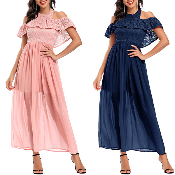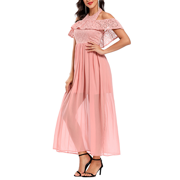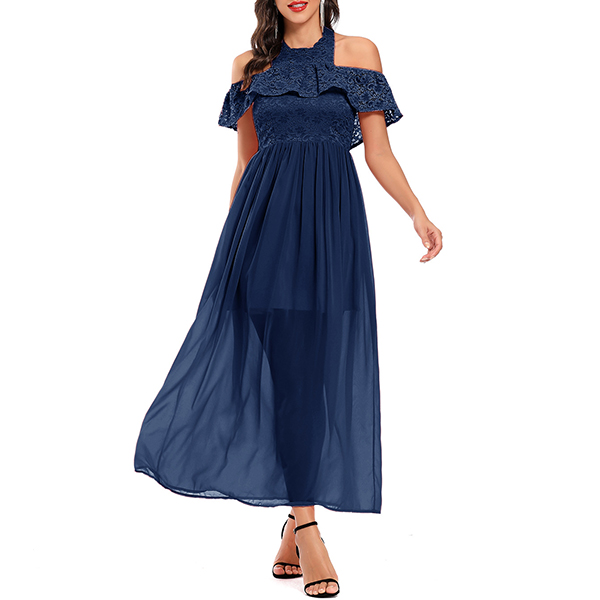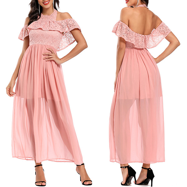 Fashion Lace Spliced Ruffle Halter Neck Open-shoulder Backless Dress