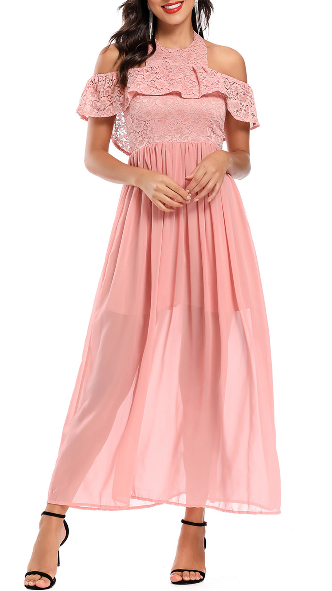 This dress features a halter neck and open-shoulder design, which creates a dynamic and alluring look. The backless design adds an extra touch of sophistication, while the lace-spliced ruffle detailing exudes feminine elegance. Wanna have one?