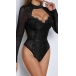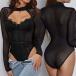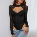Fashion Lace Spliced Semi-through Gauze Spliced Front Cutout Long Sleeve Bodysuit