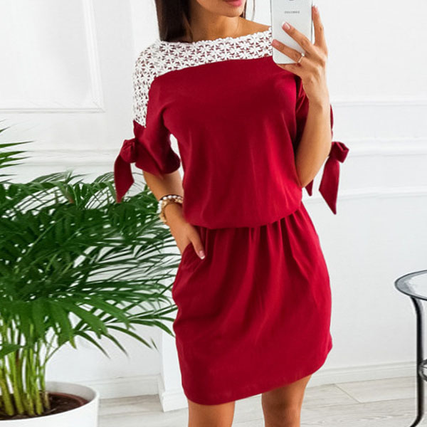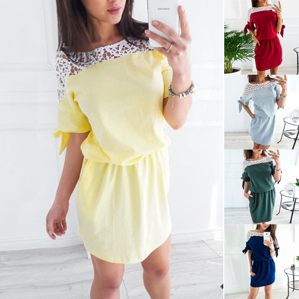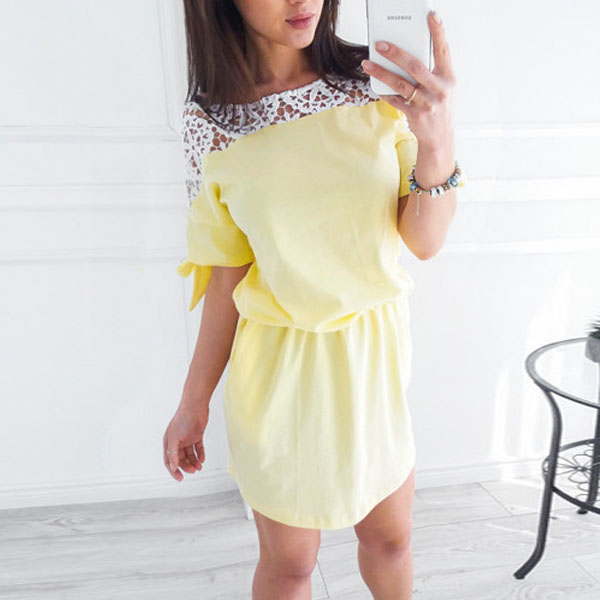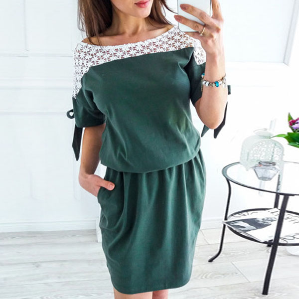 Fashion Lace Spliced Short Sleeve Round Neck Gathered Waist Dress