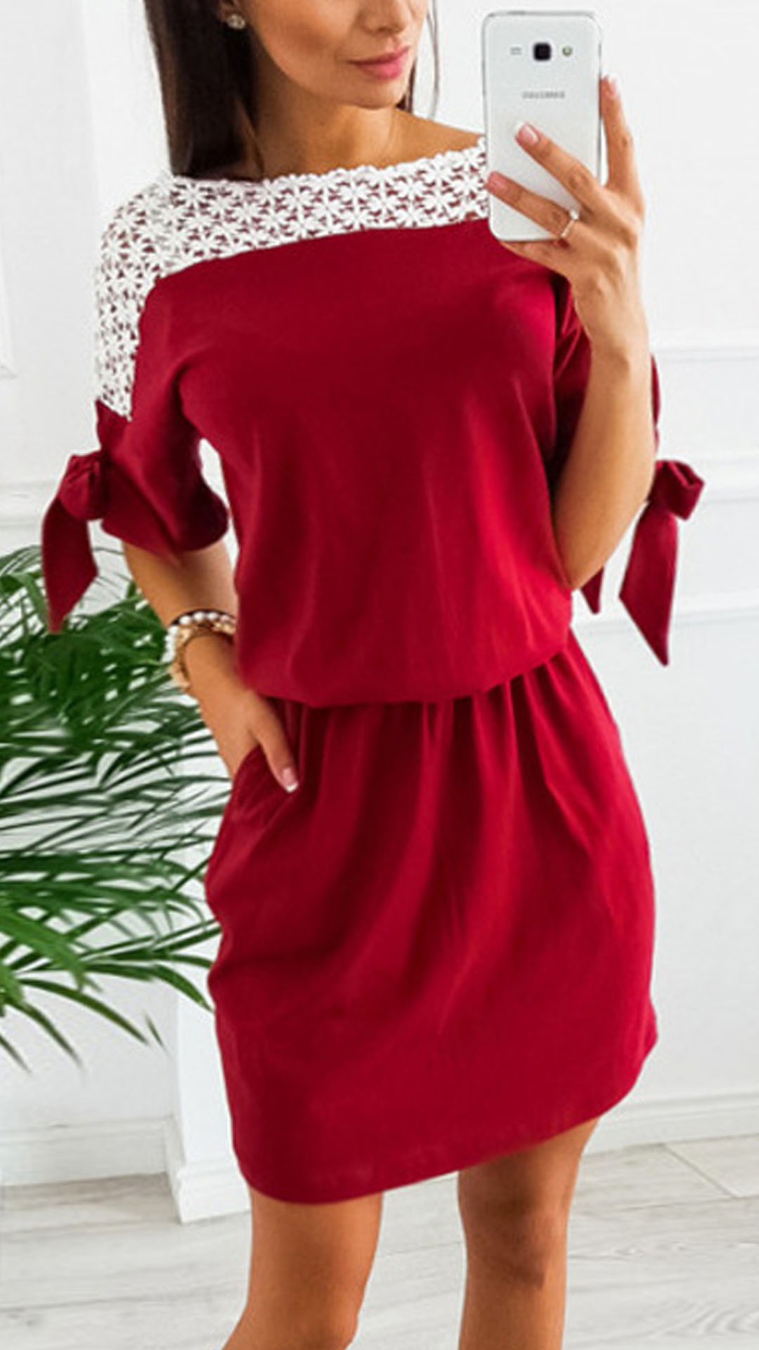 For your daily out,you can trust in this dress to express your beauty and charm. The lace spliced details and lace-up design at the cuff part will make this piece look more attractive,while the gathered waist design will showcase your waistline and figure. Dress it up with your favourite heels to achieve for a beautiful look.
