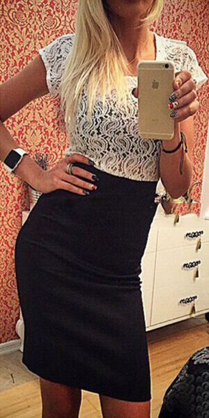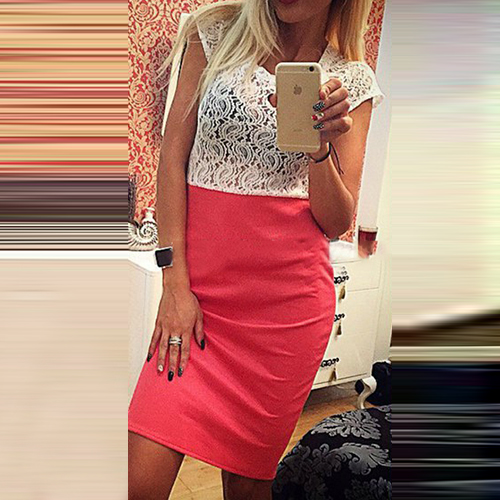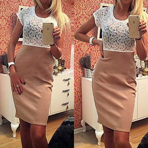 That's why we love this dress. Lace spliced style,with short sleeve,round neck and a fit silhouette,this dress