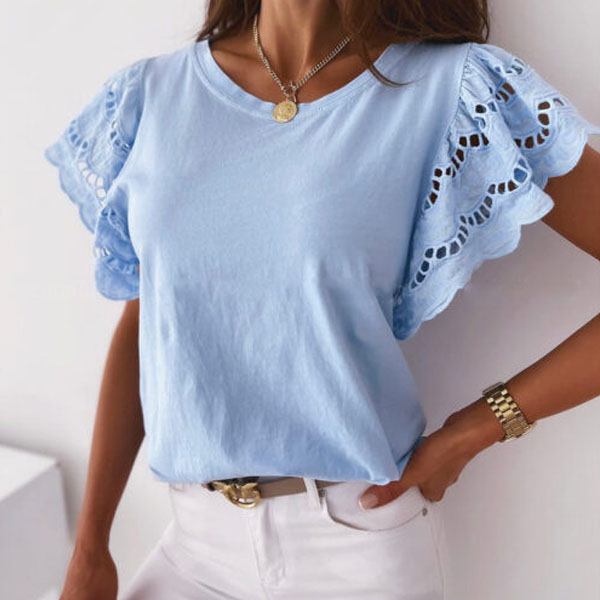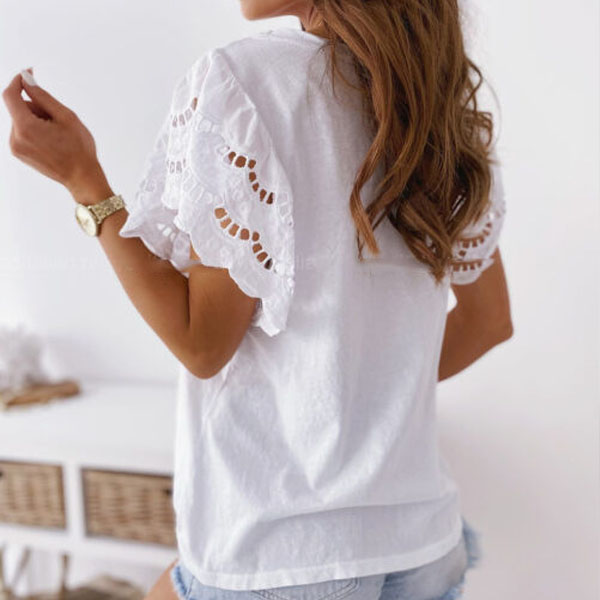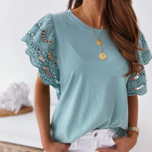 Fashion Lace Spliced Short Sleeve Round Neck Solid Color T-shirt