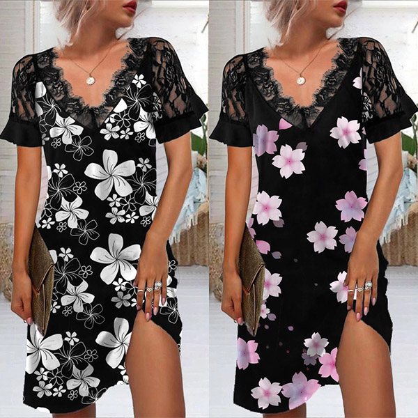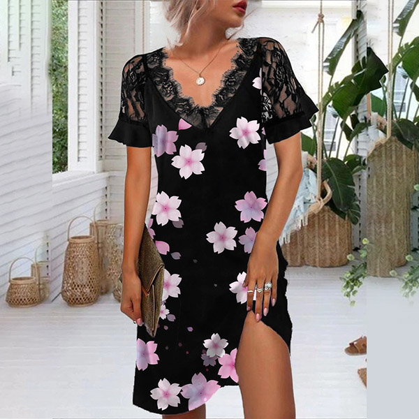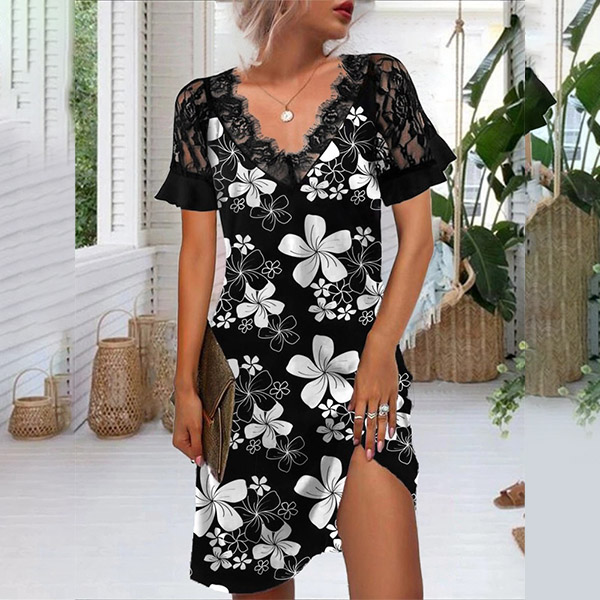 Fashion Lace Spliced Short Sleeve V-neck Printed Dress