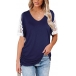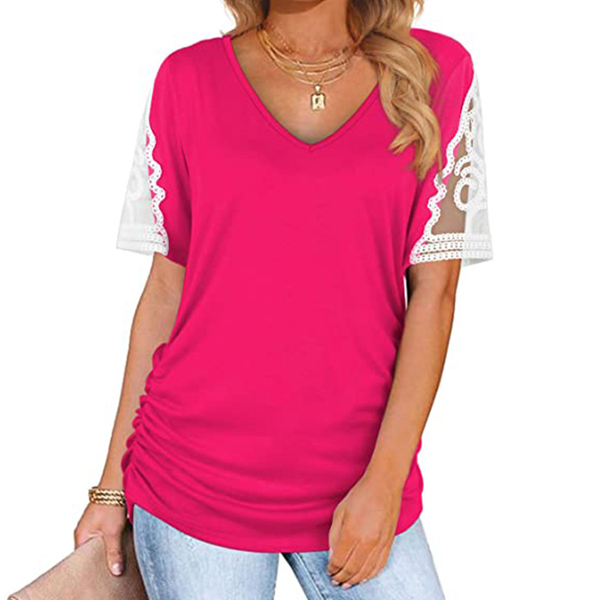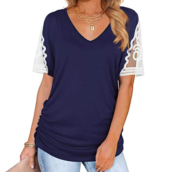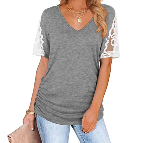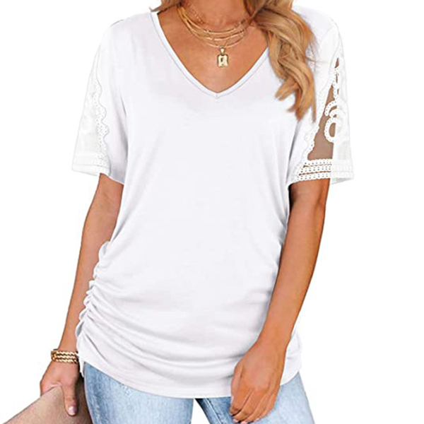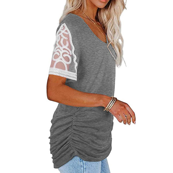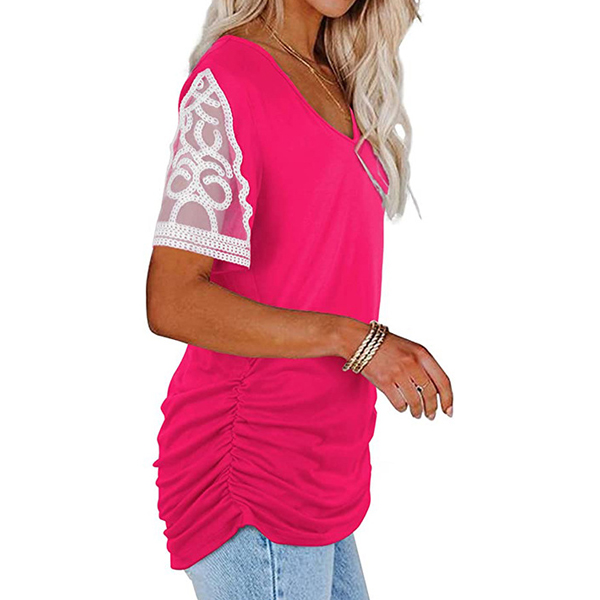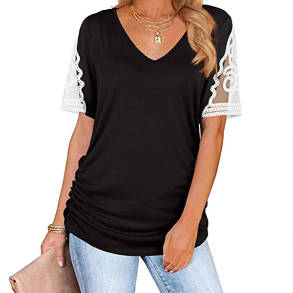 Thanks to the super soft,breathable fabric and loose silhouette design,this t-shirt can give you a long-lasting comfort. Moreover,the lace spliced short sleeve,v-neck and side wrinkled hem design will make this piece look more distinctive and attractive. For your casual days,this piece is just the thing you need. So why not buy one?