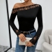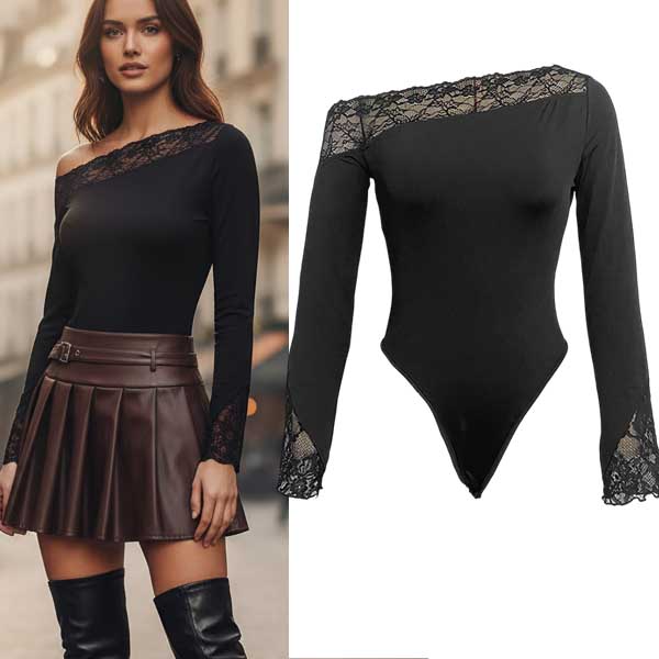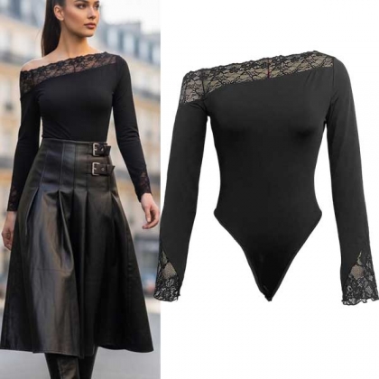 This elegant bodysuit features delicate lace splicing with contemporary slant shoulder styling for sophisticated femininity. The asymmetrical shoulder design creates dramatic neckline appeal whilst the lace detailing adds romantic texture and luxurious charm. Pair with high-waisted skirts and heels for evening elegance, or style with jeans and ankle boots for casual romantic sophistication.