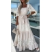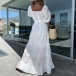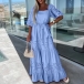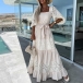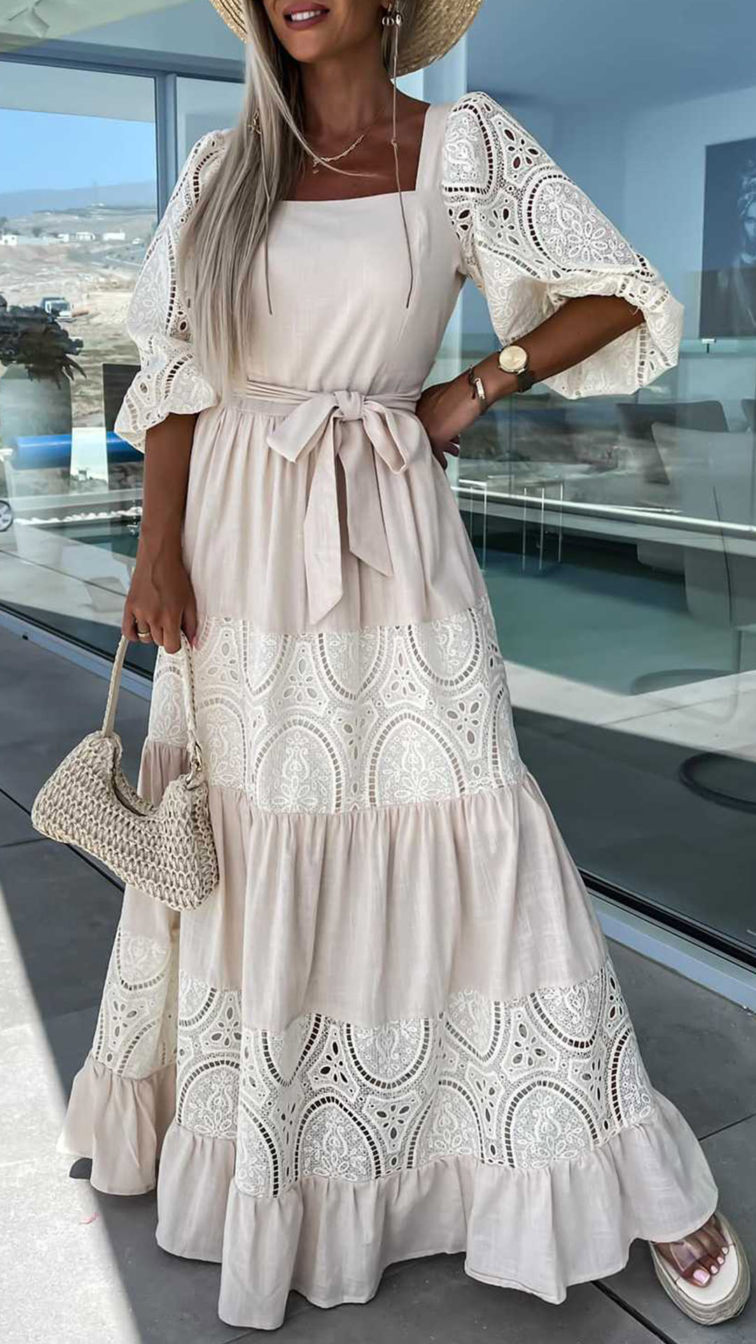 Fashion Lace Spliced Squared Neck Short Sleeve Self-tie Tiered Maxi Dress