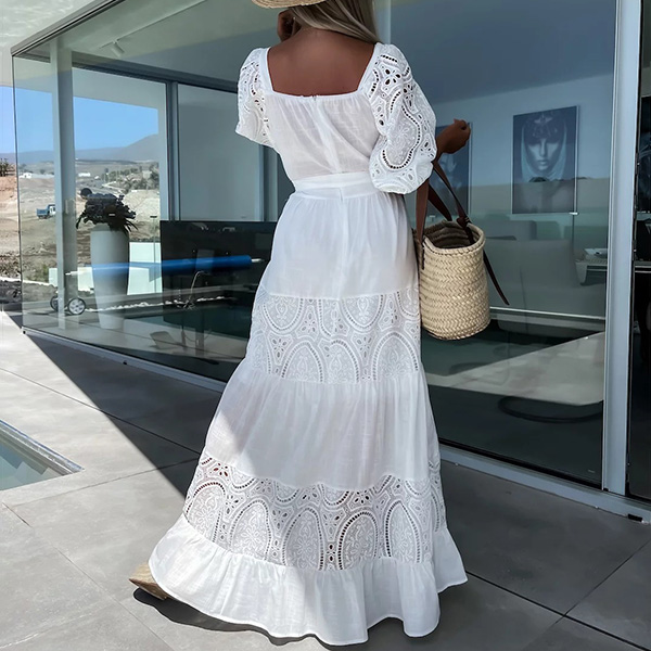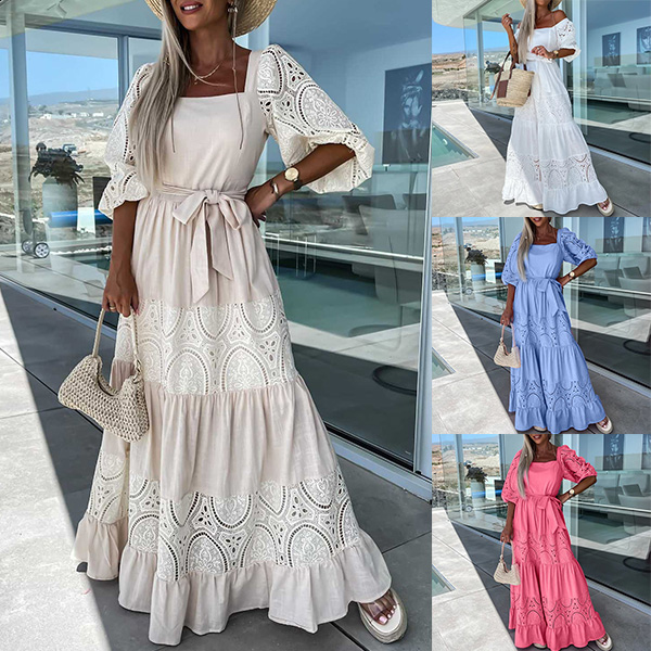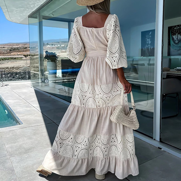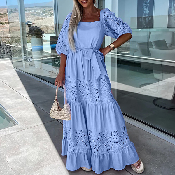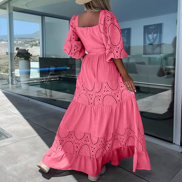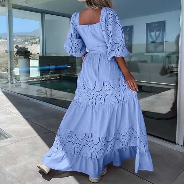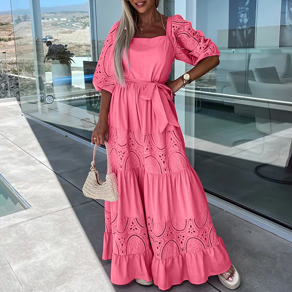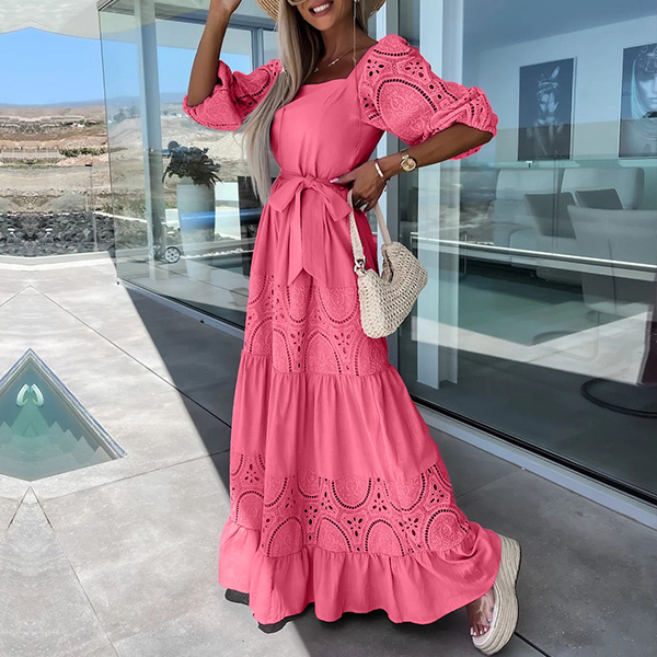 This Maxi Dress is a stunning and elegant garment that is perfect for this season. The dress features a square neckline with delicate lace splicing that adds a touch of femininity to the design. The short sleeves provide a comfortable fit, while the self-tie waist cinches in at your natural waistline to create a flattering silhouette. The tiered maxi skirt flows elegantly to the floor, creating a graceful and sophisticated look.