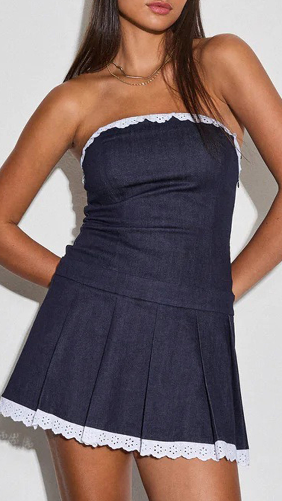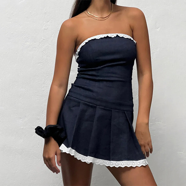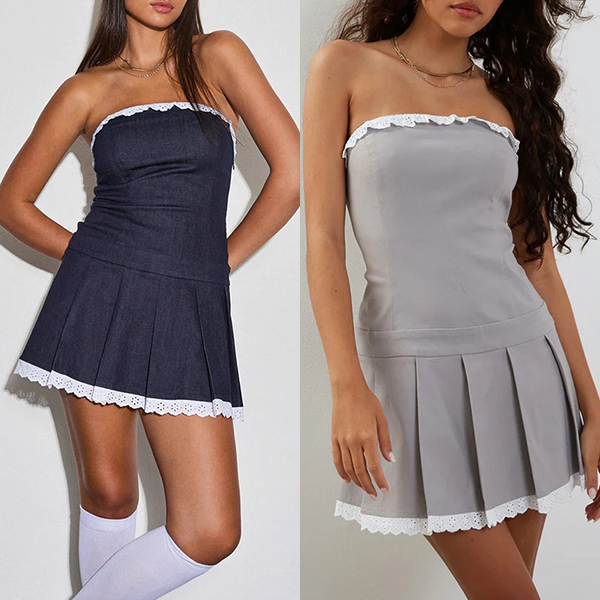 Featuring a strapless neckline with lace spliced hemline, this dress exudes a modern and sophisticated vibe. The pleated hemline adds movement and texture to the dress, creating a playful and flirty silhouette. Pair it with heels or sandals for a chic and polished look.