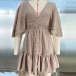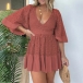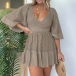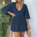 Step out in style with this fashion mini dress! This dress features delicate lace splicing, a flattering V-neck, and elegant batwing sleeves. While the ruffle hemline adds a playful touch. Pair it with sandals for a complete and chic look.