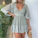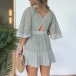 Fashion Lace Spliced V-neck Batwing Sleeve High-rise Ruffle Hemline Mini Dress