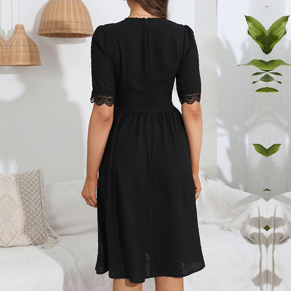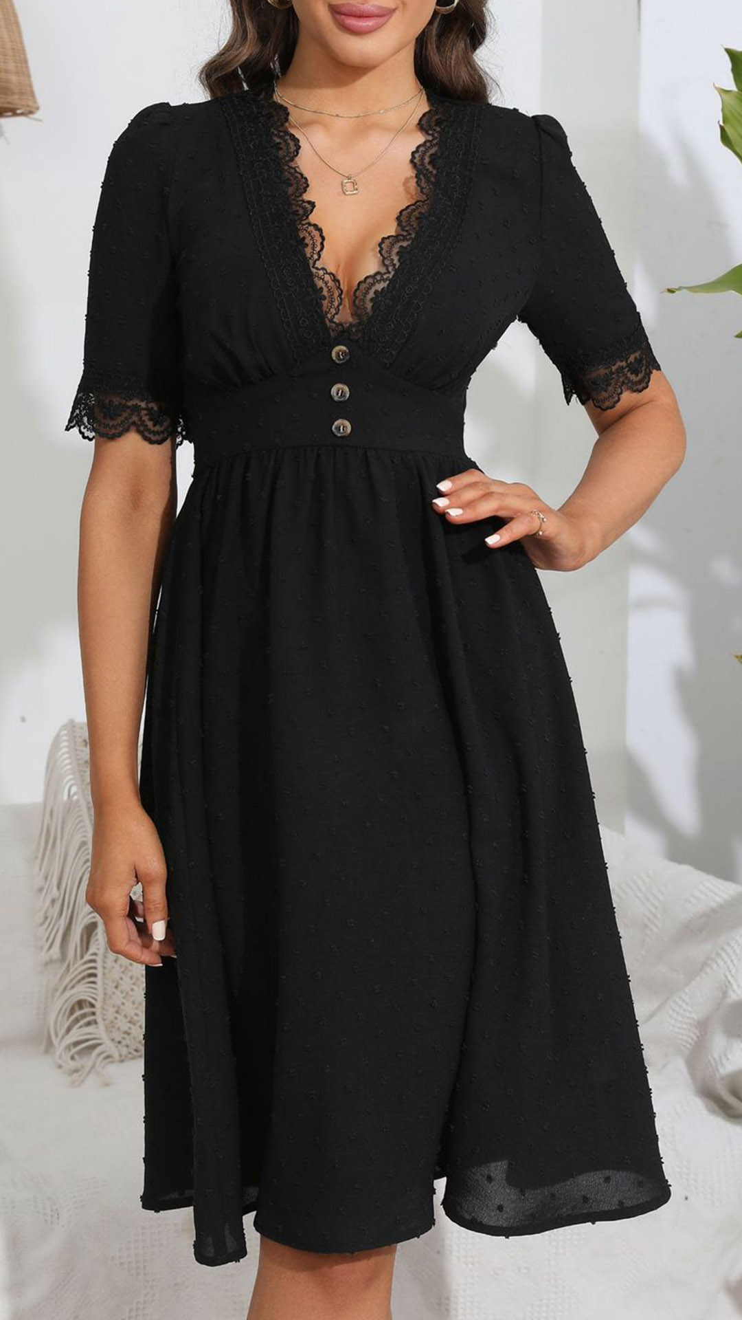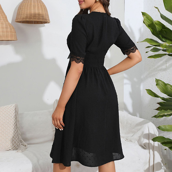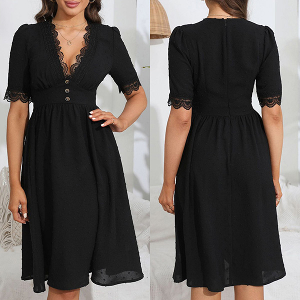 Crafted from high-quality materials, this dress features delicate lace splicing details along the short sleeve and V-neck that adds a touch of elegance to the overall design. The dress also features a comfortable and flattering A-line silhouette that complements all body types. Wanna have one?