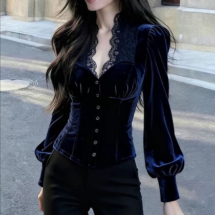 Elevate your wardrobe with this Velvet Shirt. This luxurious shirt features a flattering V-neckline adorned with delicate lace splicing that adds a touch of elegance. The front button detailing offers a classic finish, while the soft velvet fabric provides a sumptuous feel against the skin. Paired with jeans for a chic casual outfit.